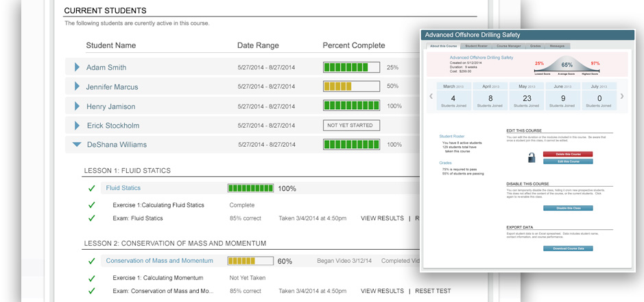 Manage each student's progress with AccuSkills Course Manager. See how much of each lesson students have completed, test results, and project activity. Then engage in group or individual online conversations no matter where your students may be,