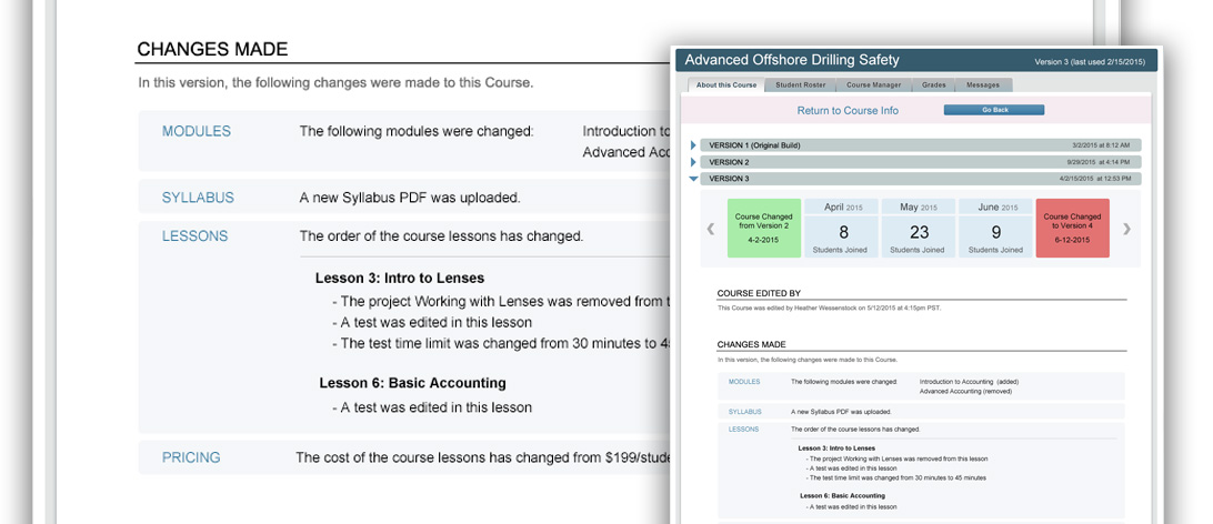 When you change the content or settings of a course, AccuSkills will track and freeze each version change. Keep track of changes and updates to ensure clean records when creating compliance courses for students.