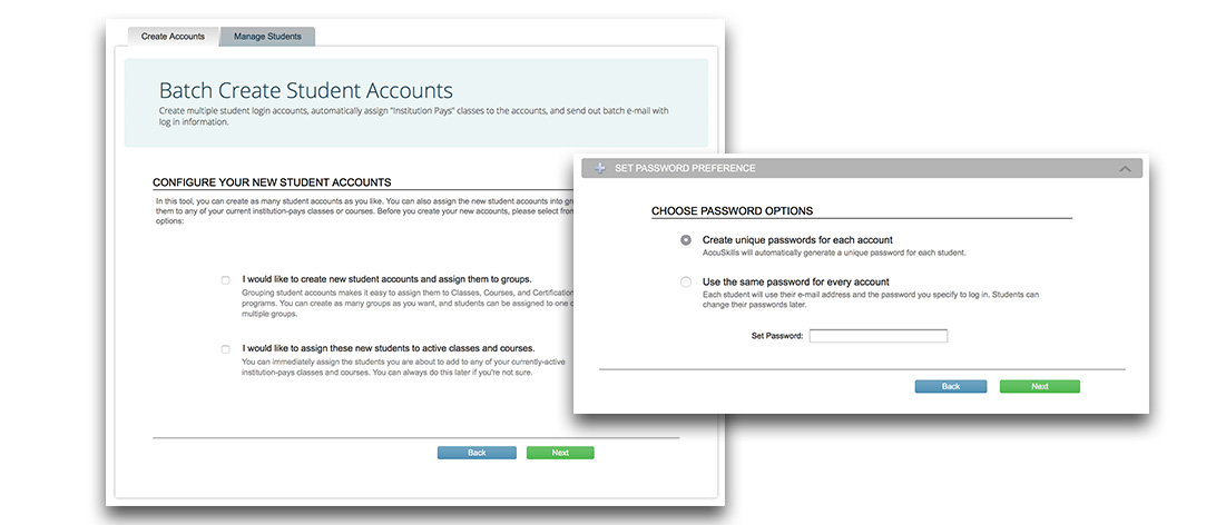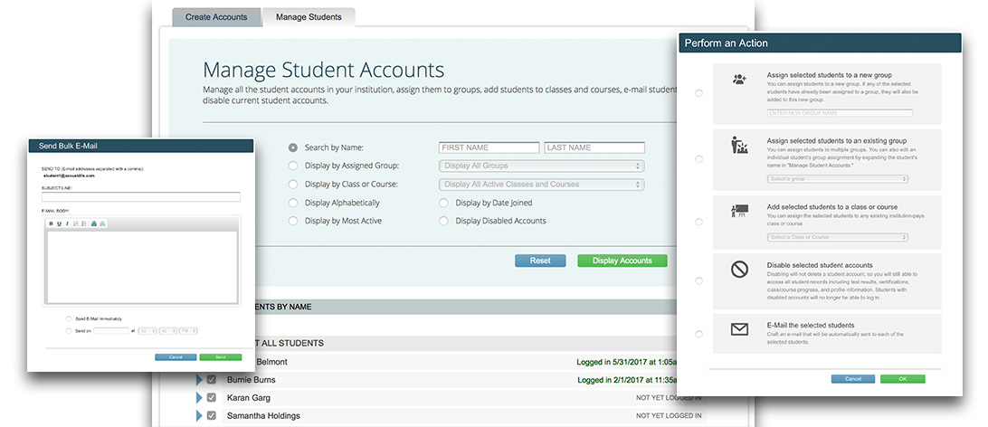 Quickly create new student accounts with as little as a name and e-mail address. AccuSkills will handle password management, allowing you to choose between a password of your choosing or generating a random password. Assign your students to groups and auto-enroll students into your classes and courses all at once.